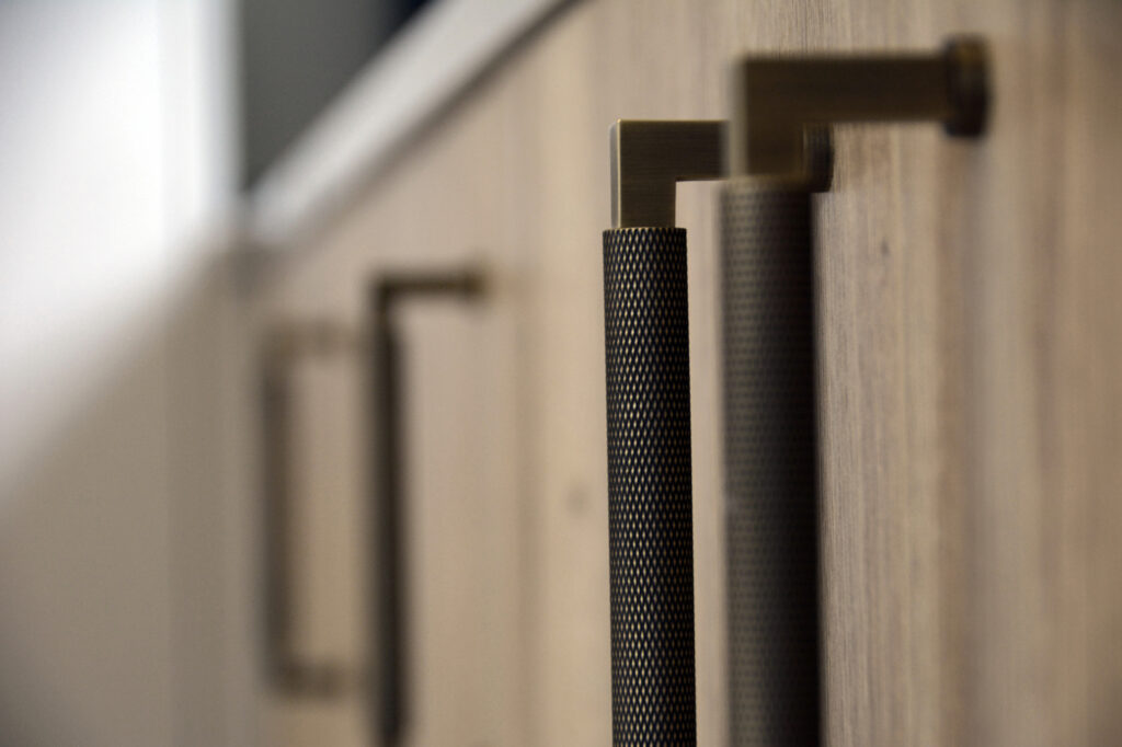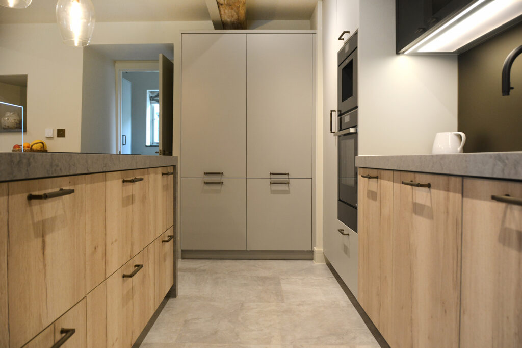 When it comes to kitchen design, the contemporary farmhouse kitchen is a trend that is here to stay. Mixing traditional elements with modern touches, this style creates a sense of charm and sophistication that is both timeless and on-trend. The seamless blending of past and present makes for a space that is not only beautiful but also functional and inviting. One of the key features of a contemporary farmhouse kitchen is its ability to effortlessly combine different materials and textures. In this project, a vintage oak finish was paired with silk grey accents to create a warm and inviting atmosphere. The addition of a satin bronze matt mirrored splashback added a touch of glamour, while the luxurious Symphony Grey Quartzstone worktop added a sleek and modern touch.