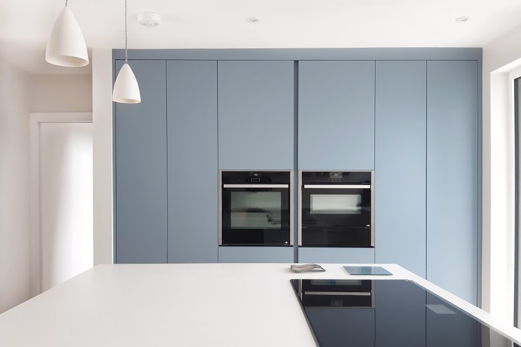 This contemporary handleless ‘H-Line’ coastal kitchen perfectly balances modern design with seaside serenity. Created as part of a wider pastel-themed interior, the soft blue and white palette brings a gentle coastal charm that feels both fresh and timeless. From morning coffee to evening entertaining, this space invites you to slow down and savour every moment.