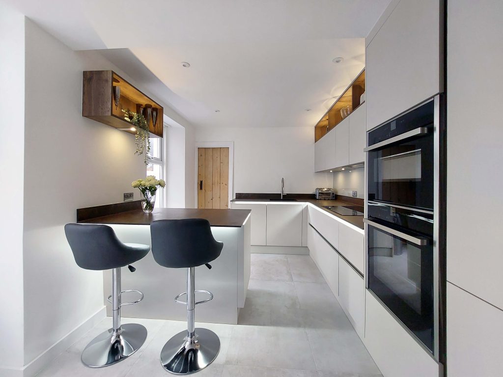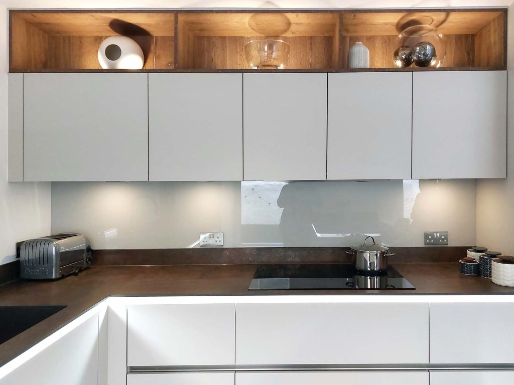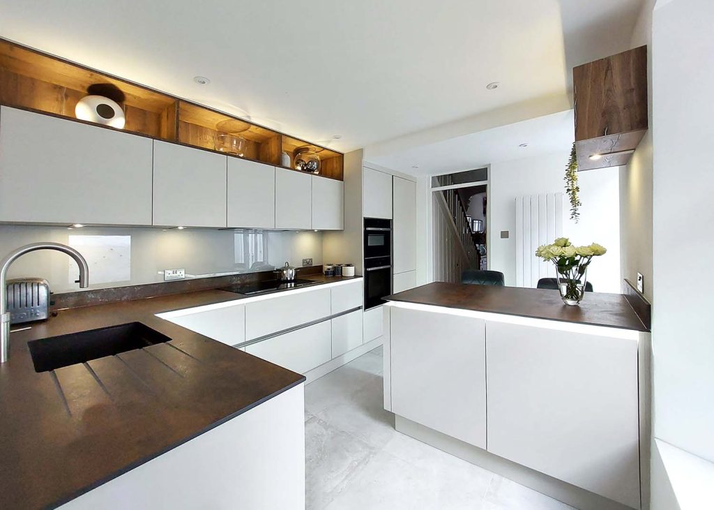 Careful planning matched with unique design details enabled us to maximise storage and create impact in this small townhouse kitchen. The brief was to create a luxurious yet practical space, that also enabled socialising as the owner often felt detached from her family whilst preparing meals. A thoughtful lighting scheme and sumptuous Neolith Iron Corten worktops created the perfect finishing touches. Our clients were delighted with their fantastic new kitchen.
