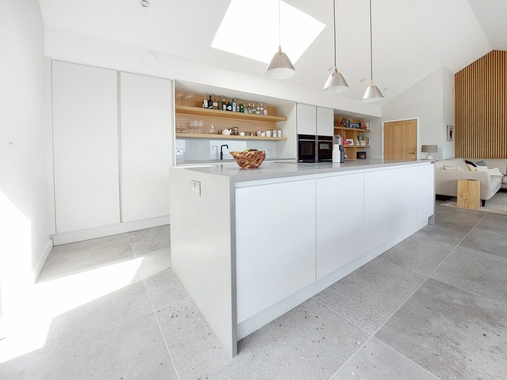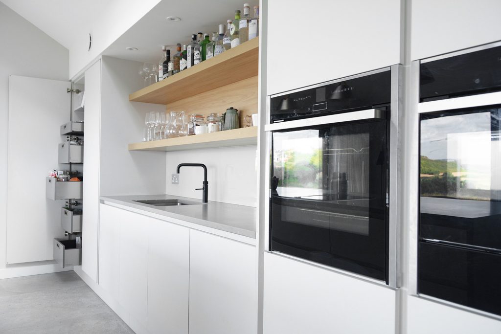 The handleless kitchen design takes full advantage of the long back wall, where tall larder storage, an integrated sink run, ovens, and open shelving are carefully aligned for both practicality and style. By keeping the lines clean and the finishes subtle, the kitchen becomes part of the overall interior flow rather than a standalone element, echoing the design vision for the home.
