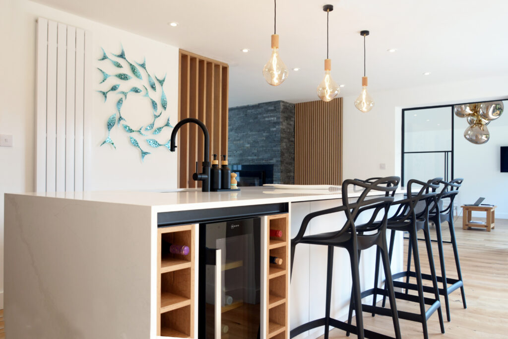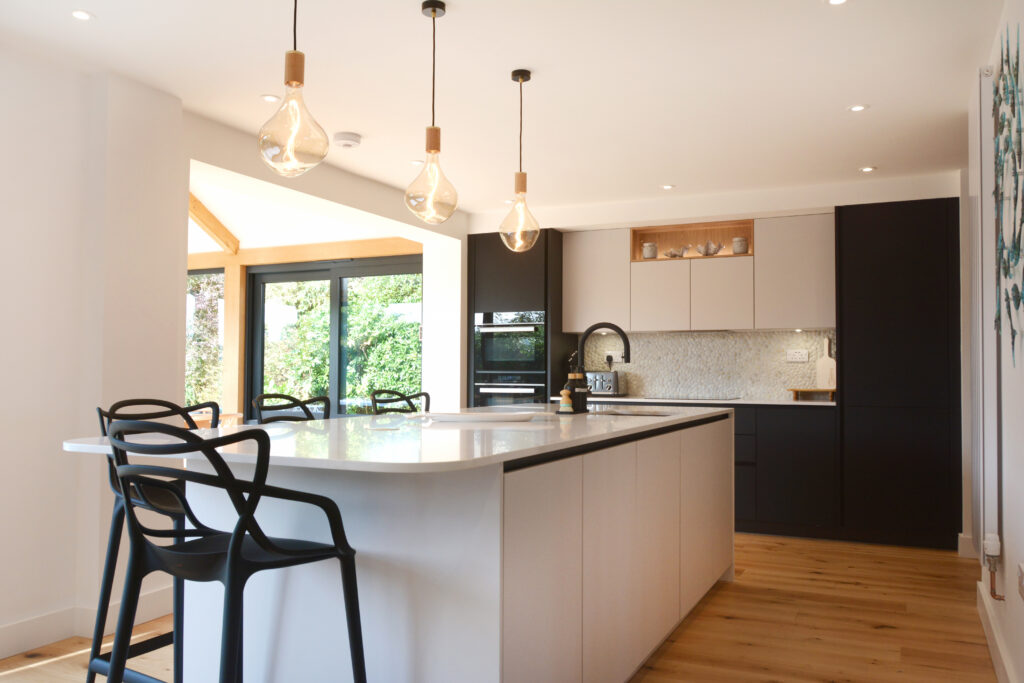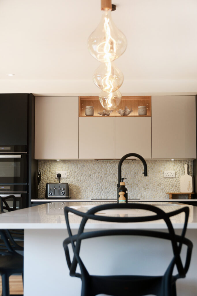 During our initial consultation we suggested a taupe and black handleless design using Hacker German kitchens, providing a welcoming colour palette that complements the natural oak features throughout. A simple, symmetrical layout provides ample storage. Dramatic black Quooker tap, sink, handlerails and appliances are highlighted by a thoughtful lighting scheme, creating a striking design solution.
